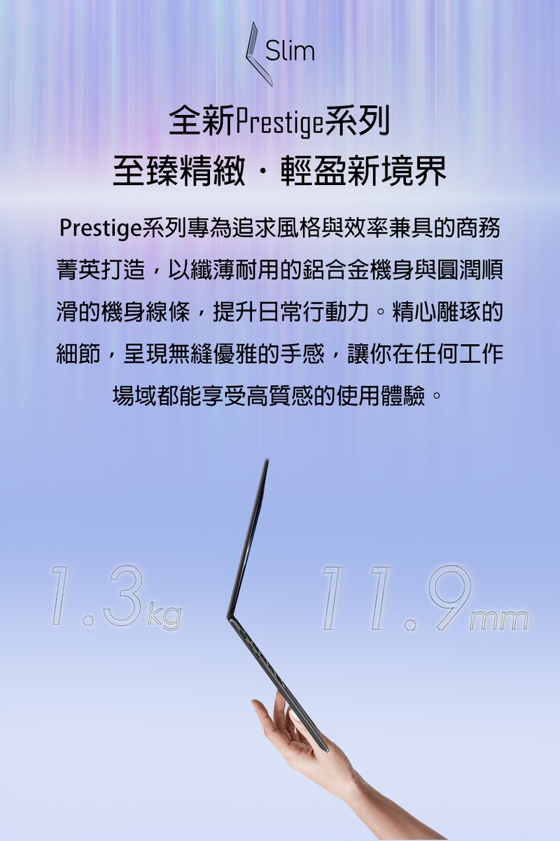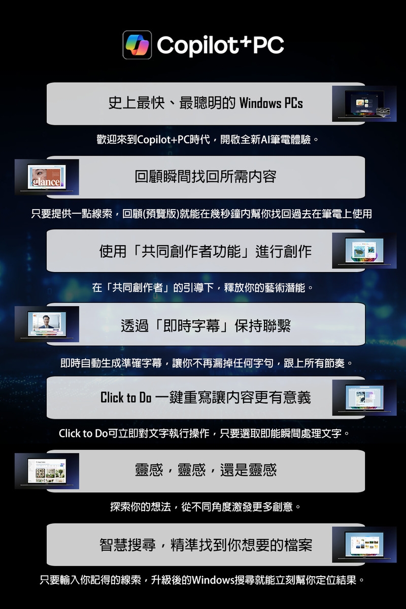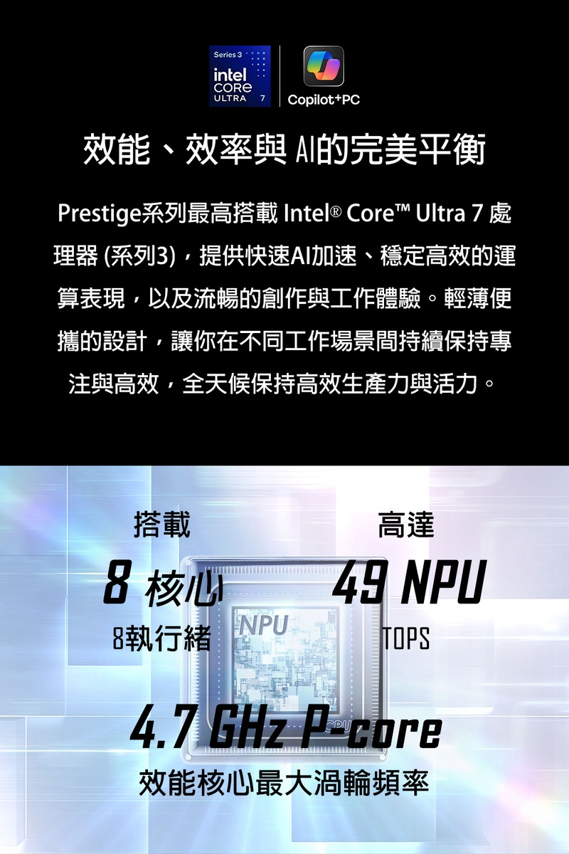 預購商品:交貨日期約3/25商品規格螢幕尺寸及解析度:14” FHD+ (1920x1200), OLED, 100% DCI-P3處理器:Intel Core Ultra 7 355 (2.3GHz/Turbo 4.7GHz)(Cache 12MB)主機板晶片:Integrated SoC主記憶體:32GB LPDDR5x onboard Memory Type硬碟:1TB M.2 SSD (NVMe PCIe)顯示晶片規格:Intel Arc™ Graphics插槽:1x M.2 SSD slot (NVMe PCIe Gen4)/O連接埠:2x Thunderbolt™ 4 (DisplayPort™/ Power Delivery 3.0)2x Type-A USB3.2 Gen21x HDMI™ 2.1 (8K @ 60Hz / 4K @ 120Hz)視訊鏡頭:IR FHD type (30fps@1080p) with HDR3D Noise Reduction+ (3DNR+)音效:2x 2W Speaker2x 2W WooferSpatial Array Microphone (3 Mic)光碟機: NO支援網路:802.11 be Wi-Fi 7 + Bluetooth v6鍵盤/輸入裝置:Single Backlit Keyboard (White) with Copilot Key/Smudge-resistant keyboard電池:4-Cell/81 Battery (Whr)變壓器:65W PD adapter作業系統:Windows 11 Pro尺寸:315.6 x 221.9 x 11.9-13.9 mm重量:1.37kg保固:2年保固台灣地區2年到府收送免費客服電話0800-018880貨源:公司貨*** 請注意:本機不含 Microsoft® Office 授權/需自行另購 ***以上規格僅供參考,若有錯誤,請以原廠官網公布為準