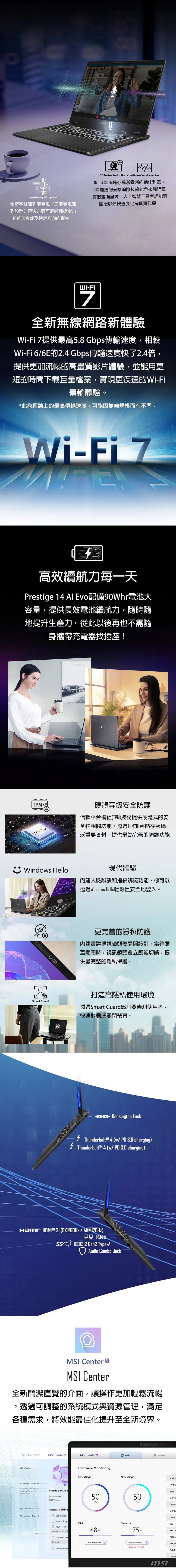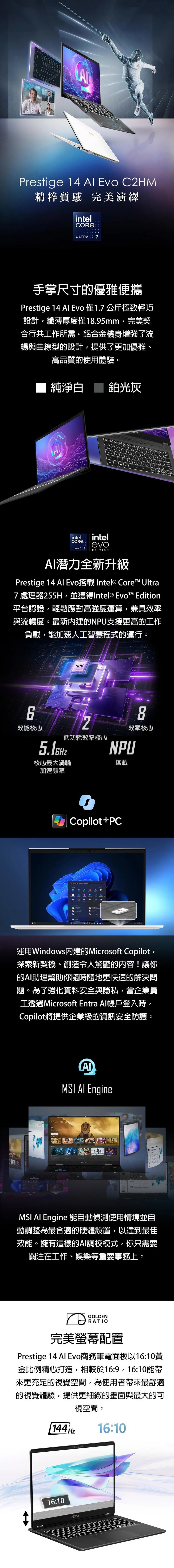 商品規格型號:Prestige 14 AI Evo C2HMG-089TW-SGU7255H32GXXDX11P螢幕:14” FHD+ (1920x1200), 144Hz, IPS-Level處理器:Intel Core Ultra 7 255H (2.0GHz/Turbo 5.1GHz)(Cache 24MB)記憶體:32GB(16GB*2) DDR5-5600 ,2Slots ,Max 96GB硬碟:1TB NVMe PCIe SSD顯示晶片:Intel® Arc Graphics插槽:2 Slots Number of SO-DIMM Slot/2x M.2 SSD slot (NVMe PCIe Gen4)I/O連接埠:1x HDMI™ 2.1 (8K @ 60Hz / 4K @ 120Hz)1x RJ451x Type-A USB3.2 Gen22x Thunderbolt™ 4 (DisplayPort™/ Power Delivery 3.0)視訊鏡頭:IR FHD type (30fps@1080p) with HDR/3D Noise Reduction+ (3DNR+)音效:2x 2W Speaker/1x Mic-in/Headphone-out Combo Jack光碟機:無,請另購外接式光碟機支援網路:Gb LAN/Intel® Killer™ BE Wi-Fi 7 + Bluetooth 5.4鍵盤/輸入裝置:Single Backlit Keyboard (White) with Copilot Key電池:4-Cell / 90 Battery (Whr)變壓器:100W PD adapter作業系統:Windows 11 Pro尺寸及重量:313.4 x 246.5 x 18.95 mm/1.7 kg保固:2年保固台灣地區2年到府收送免費客服電話0800-018880貨源:公司貨*** 請注意:本機不含 Microsoft® Office 授權/需自行另購 ***以上規格僅供參考,若有錯誤,請以原廠官網公布為準