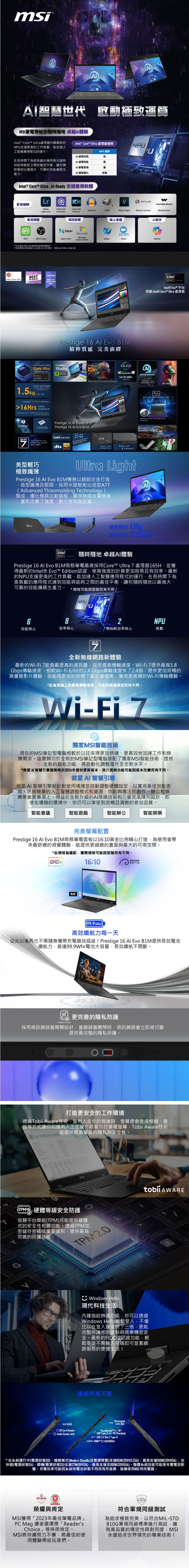 商品規格螢幕尺寸及解析度:16" FHD+(1920x1200) IPS LEVEL 100%sRGB處理器:Intel Core Ultra 7 165H (1.4GHz up to 5.0GHz,24M Cache)16 cores;Intel AI Boost NPU記憶體:32GB*1 LPDDR5 Onboard硬碟: 1TB M.22 PCIe SSD作業系統: Windows 11 Pro顯示晶片: Intel Arc Graphics無線網路: 802.11 be Wi-Fi 7 + Bluetooth v5.4視訊鏡頭: IR FHD type (30fps@1080p) with HDR指紋辨識SD (XC/HC) Card ReaderI/O: 2*Type-C (USB / DP / Thunderbolt 4) with PD charging,1*Type-A USB3.2 Gen2, 1*HDMI 2.1 (8K@60Hz)1*RJ45, 1*耳機麥克風孔電池: 4-Cell / 99.9 Battery (Whr)變壓器: 100W PD adapter白色背光鍵盤重量: 1.5 kg尺寸: 358.4 x 254.4 x 16.85-18.95 mm3年保固,台灣地區3年到府收送配件: 無包鼠貨源:公司貨以上規格僅供參考,若有錯誤,請以原廠官網公布為準