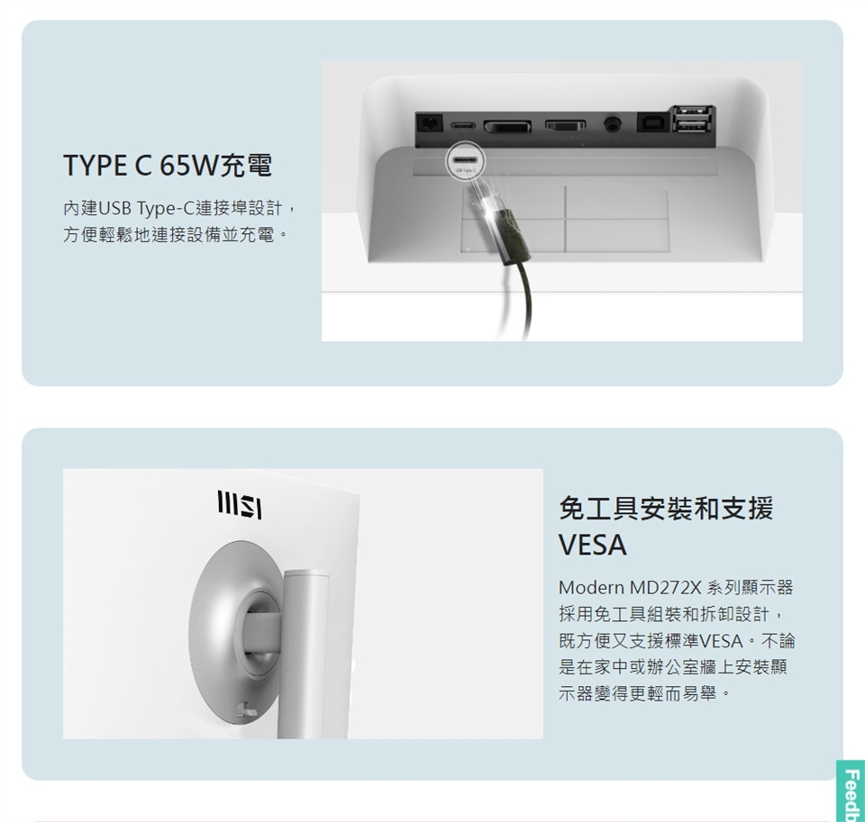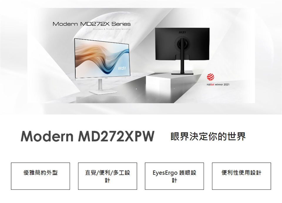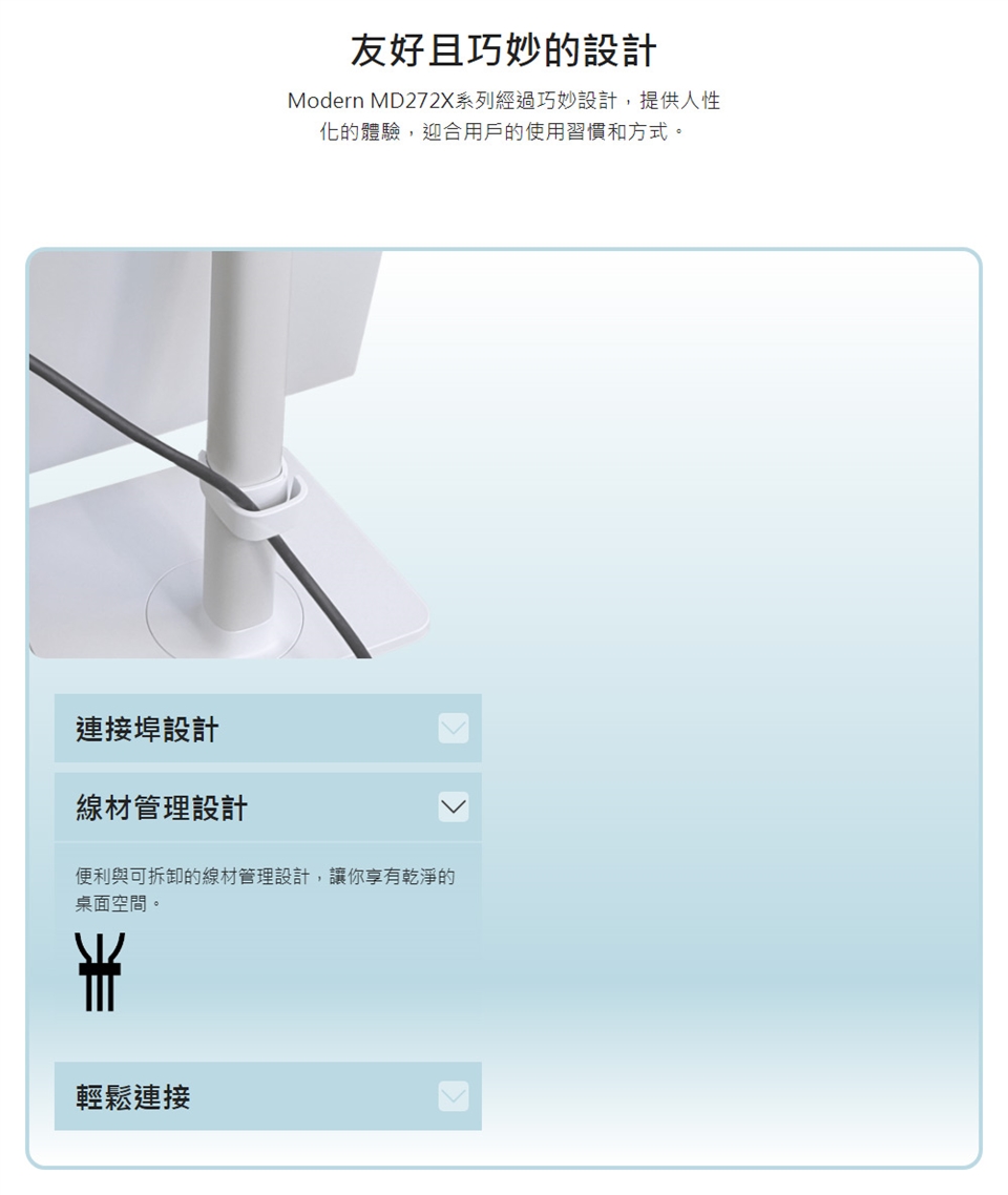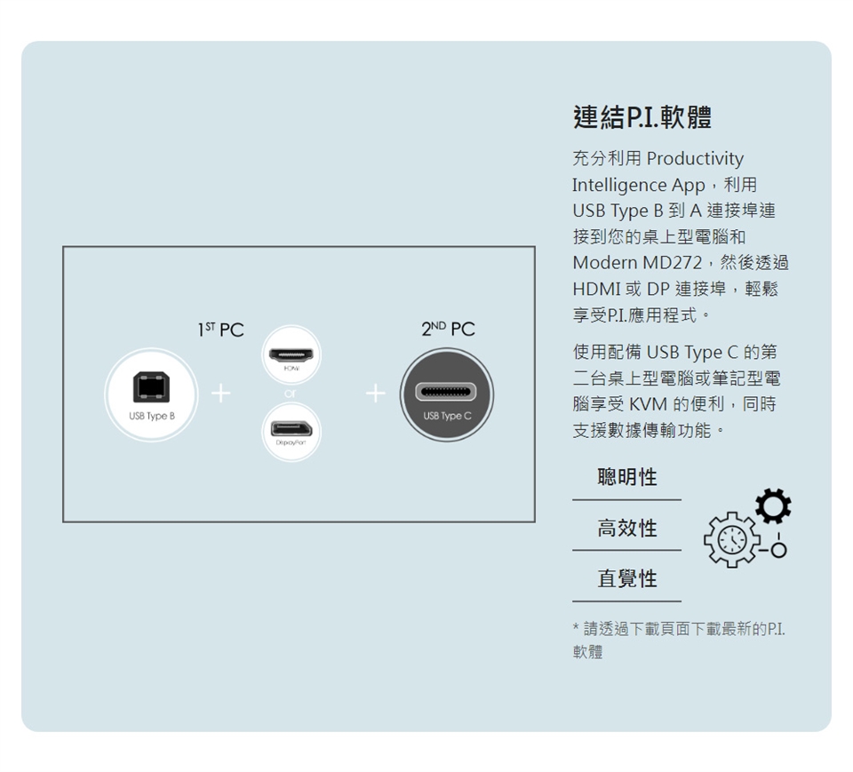 KVM 功能透過一組鍵盤、滑鼠與 Modern MD272 系列顯示器無縫控制多個設備