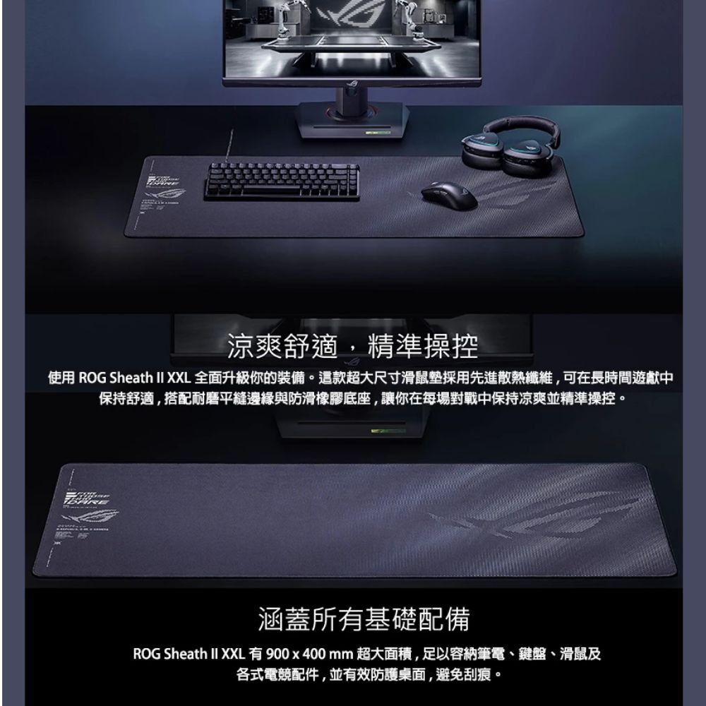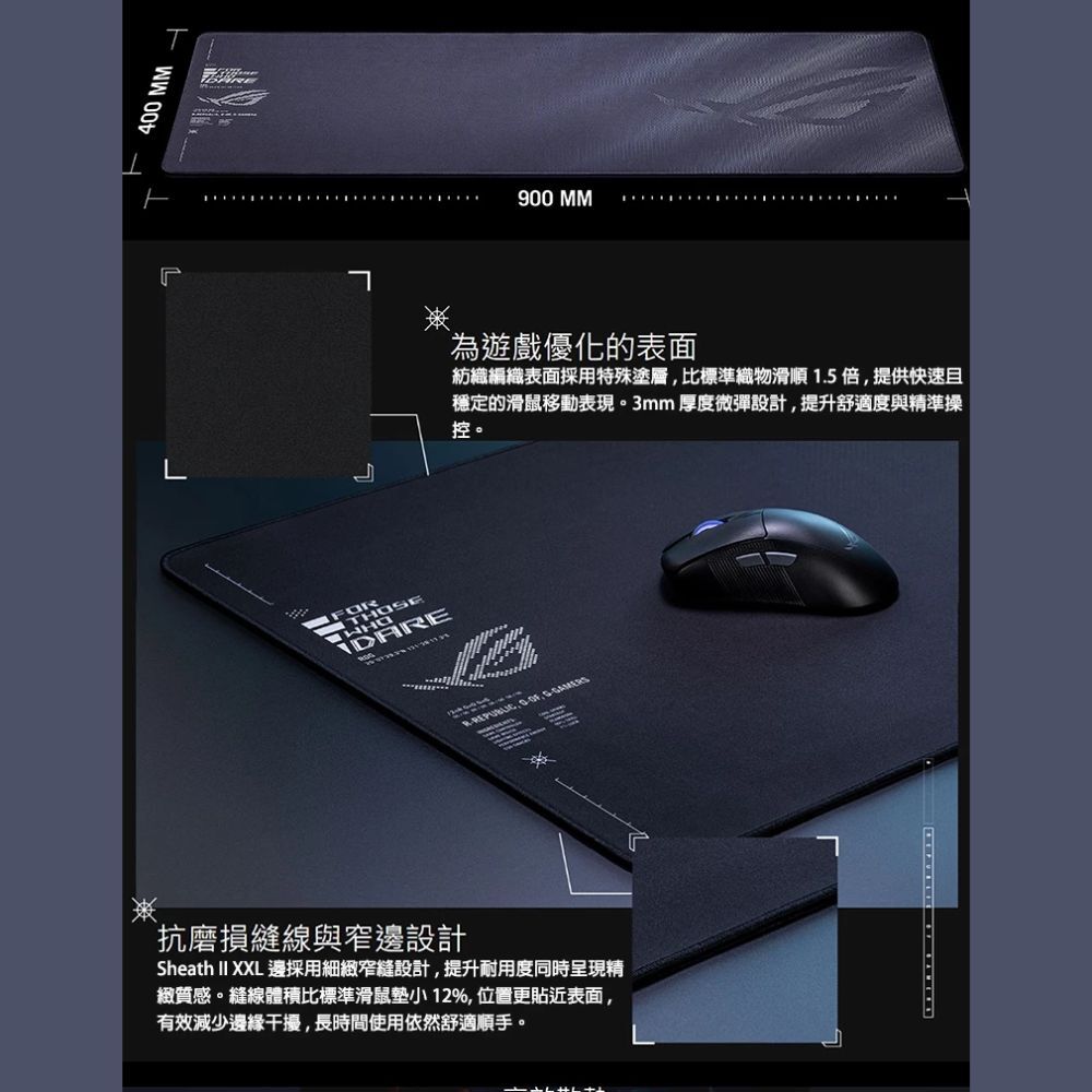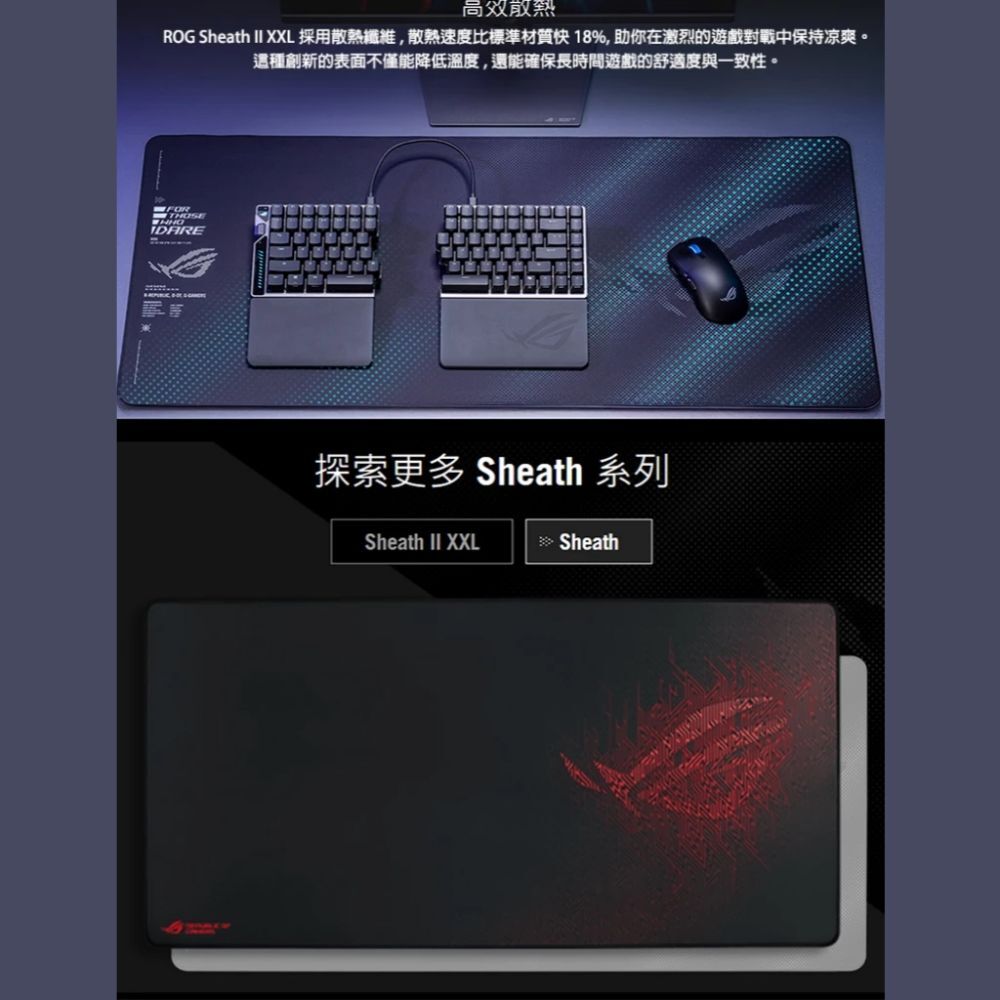 ROG Sheath II XXL 是一款超大尺寸電競滑鼠墊,結合先進散熱纖維、耐磨平縫邊緣與防滑橡膠底座。