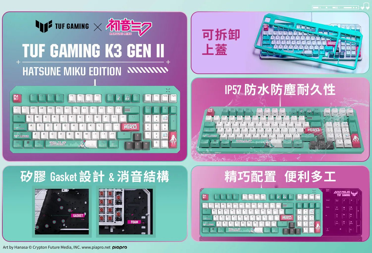 型號:TUF Gaming K3 Gen II Hatsune Miku EditionKey Switch:Optical-Mechanical RGB SwitchConnectivity:USB 2.0 (TypeA)Size (Full/TKL):96%Lighting:RGB Per keysAURA Sync:YesAnti-Ghosting:N Key RolloverMacro Keys:Programmable F1-F8 keysUSB Report rate:(USB Report rate)1000 HzCable:2-meter rubber cableOS:Windows® 11Software:Armoury CrateDimensions:385 x 153 x 38mmWeight:1068g (with cable)Color:GreenContents:1 x TUF Gaming K3 Gen II - Hatsune Miku Edition1 x Quick Start Guide1 x warranty booklet貨源:公司貨*以上規格僅供參考,若有錯誤,請以原廠官網公布為準。